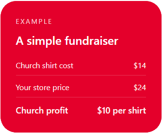 Launch a fully branded online church store for shirts, hoodies, tumblers, hats, and more. Your members order online, we handle fulfillment, and your church keeps the profit.
